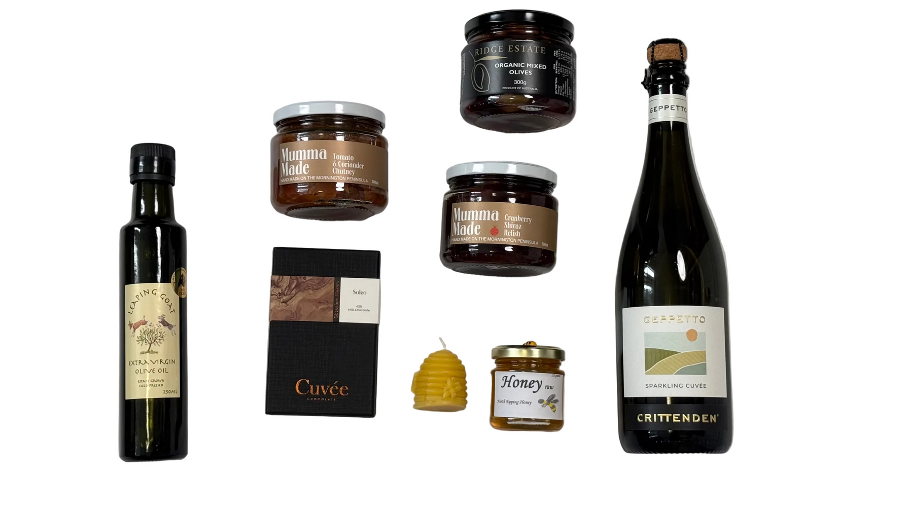 In recognition of its gourmet credentials, our Flinders hamper is dedicated to the best produce from the Peninsula. As an entrée to the Traditional box we have Ridge Estate’s award winning Extra Virgin Olive Oil paired with Ridge Estate Dukkah and Mumma Made ever popular Tomato Relish. For the culinary connoisseur we’ve added The Garlic Company’s Black Garlic & Chilli Relish and Red Hill Truffles, Truffle Honey – rich, unique and delectable. To round things off we’ve included Cuvee Dark Chocolate and Crittenden Estate’s Geppetto Pinot Noir to pull the flavours together. Truly a hamper for the very special foodie in your life.